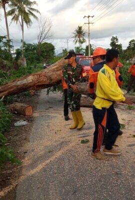 Sumbawa Barat – NTB, Sebuah pohon tumbang sempat menutupi jalan di depan BTN Baiti Jannati, Kelurahan Bugis, Kamis sore (4/12/2025) pukul 17.00 WITA. Kejadian