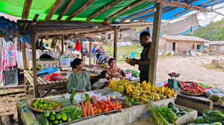 SUMBA TENGAH — Babinsa Koramil 03/Katikutana Kodim 1613/Sumba Barat, Kopda Aminullah, melaksanakan kegiatan Komunikasi Sosial (Komsos) dengan para pedagang di Pasar Anakalang, Desa Anakalang,