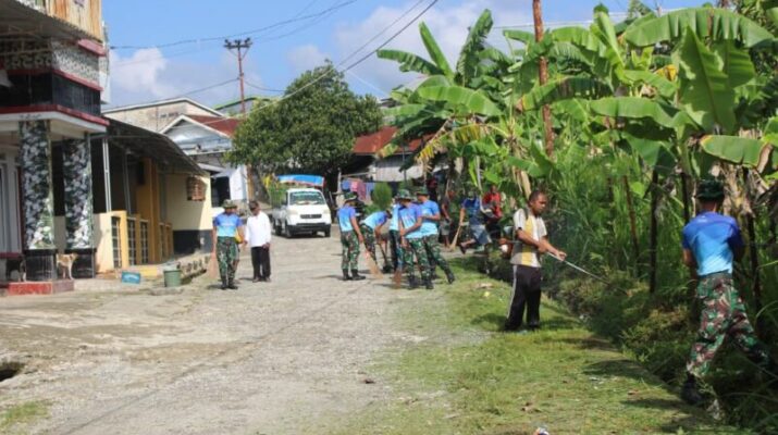 Satgas Pamtas Yonarhanud 2 Kostrad Berkolaborasi dengan Masyarakat Bersihkan Jalan Desa