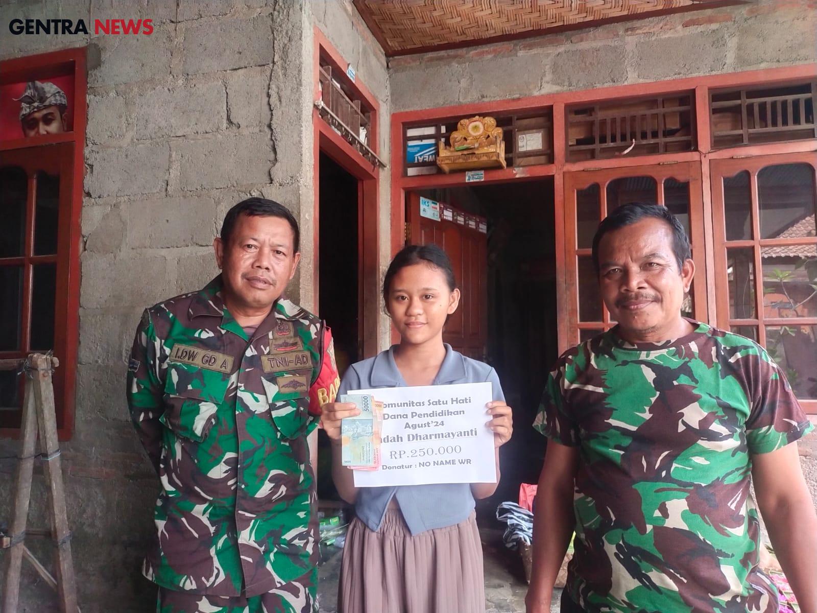Tunaikan Amanah, Babinsa Gunaksa Serahkan Dana Bantuan Pendidikan dari Komunitas Satu Hati Bali Kepada Empat Anak di Wilbin