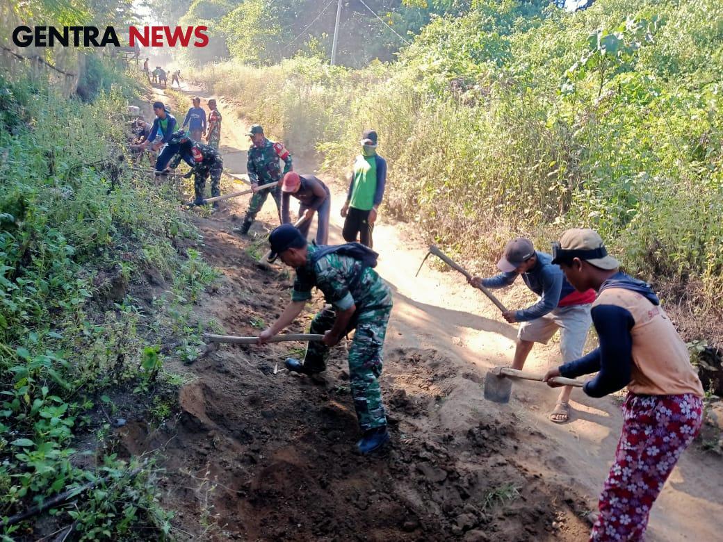 Koramil 05/ Pekat, Gelar Kegiatan Gotong Royong Membersihkan dan Perbaikan Jalan Menuju Pura Agung Tambora