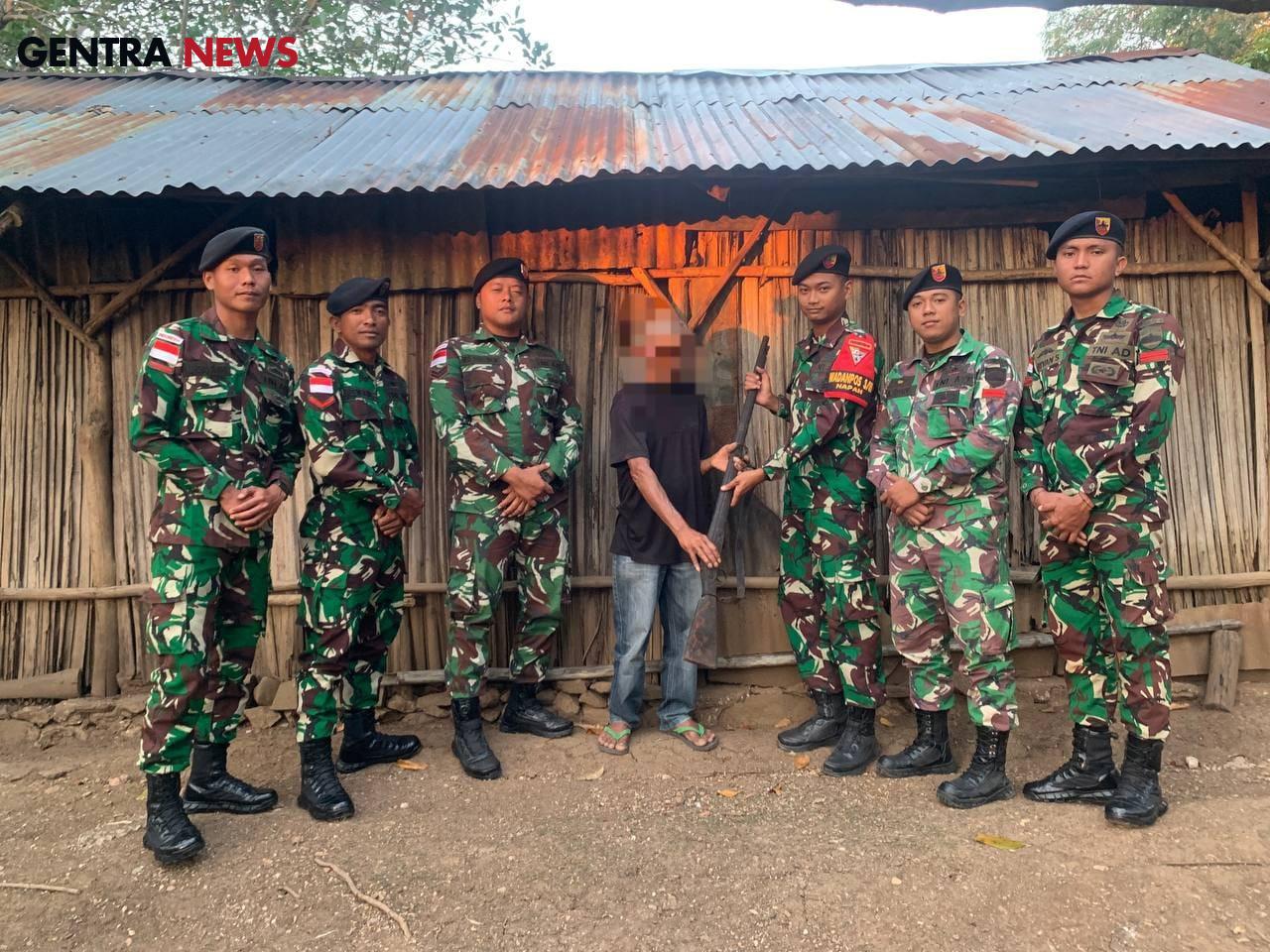 Napan, NTT – Melalui Komunikasi Sosial dan pendekatan secara Humanis, Pos Napan Satgas Yonkav 6/Naga Karimata sukses mendapatkan satu pucuk senjata rakitan jenis Flintlock
