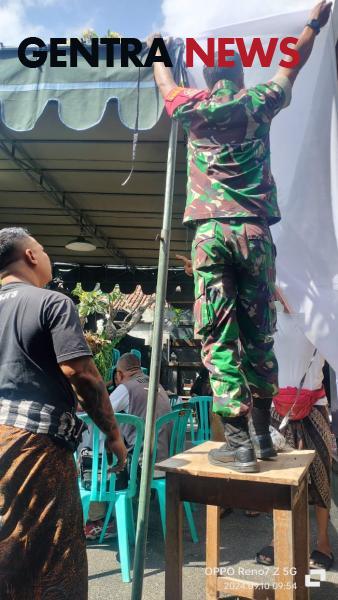 Klungkung,- Jelang upacara pengabenan salah satu warga binaan, Babinsa Semarapura Kauh Koptu Wayan Sutamaya terjun langsung membantu warga melaksanakan penyiapan sarana dan prasarana pengabenan,Selasa
