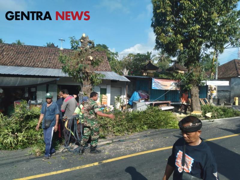 Klungkung,- Dalam rangka melancarkan rangkaian pelaksanaan karya pedudusan agung di Pura Dalem Desa Tegak, Babinsa Peltu Gede Anta bersama DLHP melaksanakan pemotongan pohon, Jumat