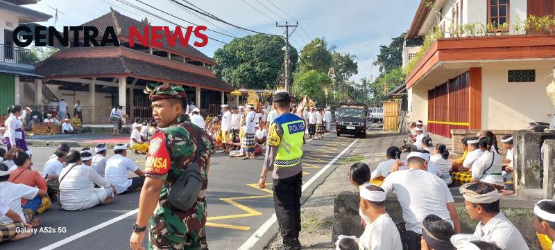 Klungkung,- Babinsa Tohpati Kopda Komang Puspantara bersama Bhabinkamtibmas dan pecalang melaksanakan pengawalan dan pengamanan kegiatan sesolahan ida sesuhunan pura dalem Desa Adat Tohpati, Sabtu