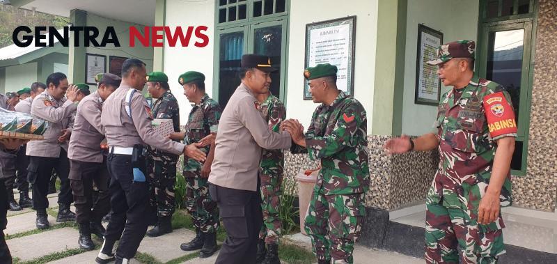 Sumbawa Barat – Kapolsek Seteluk Iptu Siswoyo S. H. bersama anggotanyamendatangi Koramil 1628-03/Seteluk memberikan kue ucapan selamat HUT TNI ke-79 kepada Koramil 1628-3/Seteluk dan