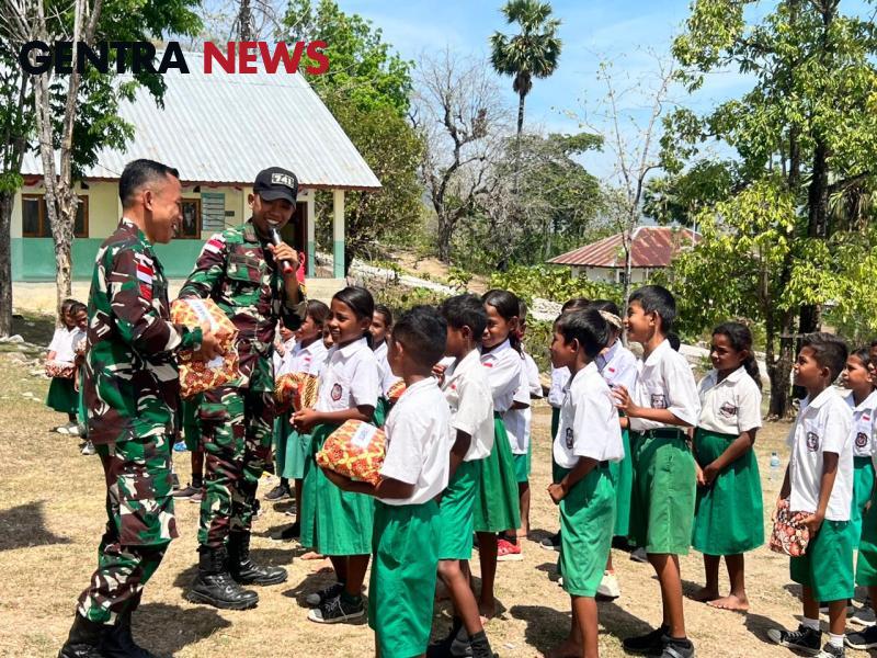 Belu – Prajurit Pos Delomil Satgas Pamtas RI-RDTL Yonif 741/GN melaksanakan kegiatan mengajar dan memperkenalkan Tugas TNI di NKRI serta mengadakan perlombaan PBB dilapangan