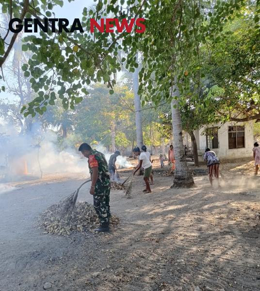 Gentra News NTT Rote Ndao – Babinsa 03/Batutua Kodim 1627/Rote Ndao, Serka Herman Muskananfola bersama warga membersihkan lingkungan dari sampah,bertempat di Dusun Mbiu Barat