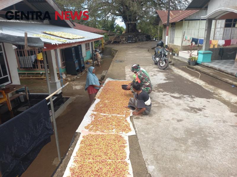 Babinsa Ikut Membantu Warganya Jemur Hasil Panen Cengkeh.