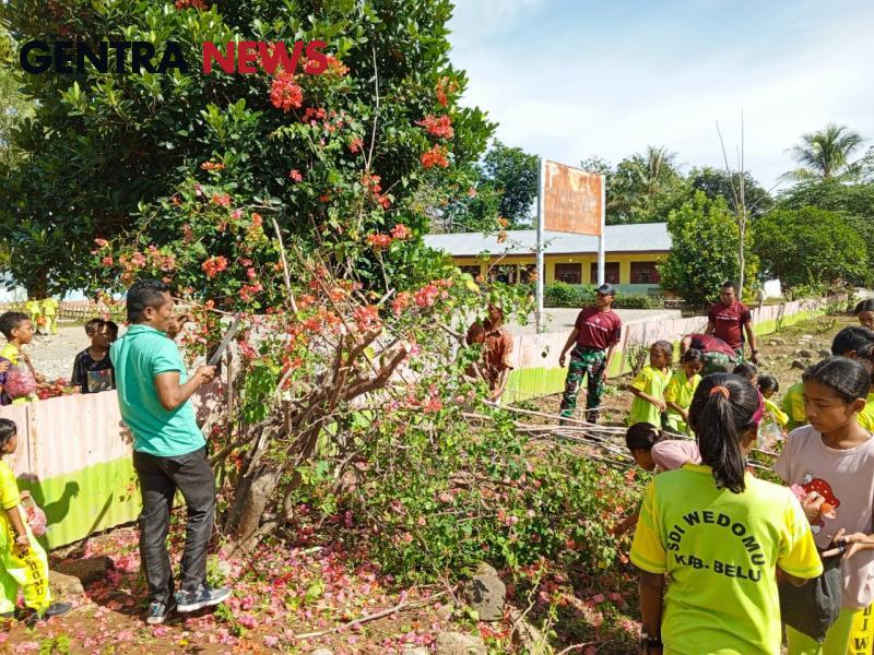 Gentra News Bali – Belu – Satgas Pamtas Yonif 741/GN Pos Fatubesi turut ikut serta dalam pelaksanakan karya bakti bersama guru dan murid SD