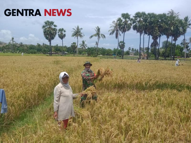 Gentra News NTT – Koptu Mukmin Matoke Babinsa Koramil 05/ Waingapu Kodim 1601/Sumba Timur membantu warga memotong padi di wilayah binaan Kelurahan Mauhau. Kegiatan