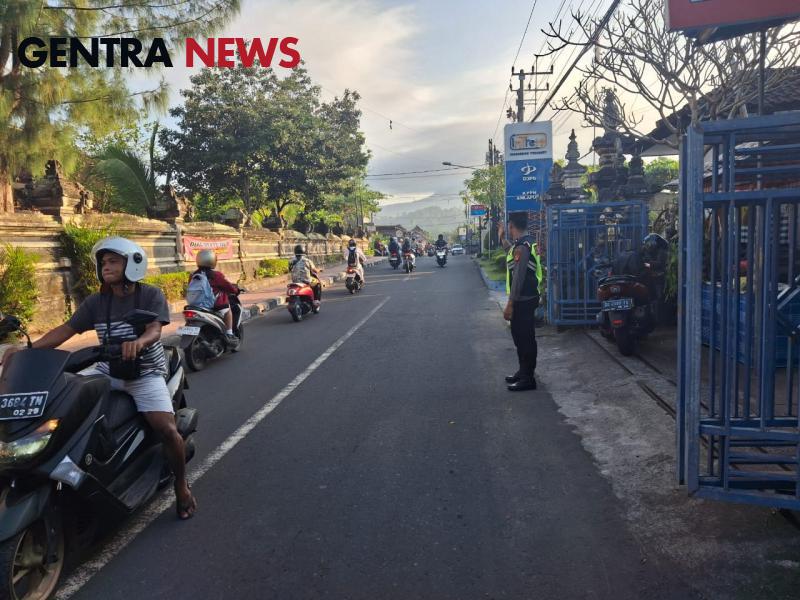 Gentra News Bali – Personil Sikum melaksanakan pengaturan pos pagi (strong point pagi) arus lalu lintas di Depan SMPN 5 Amlapura pada hari Senin