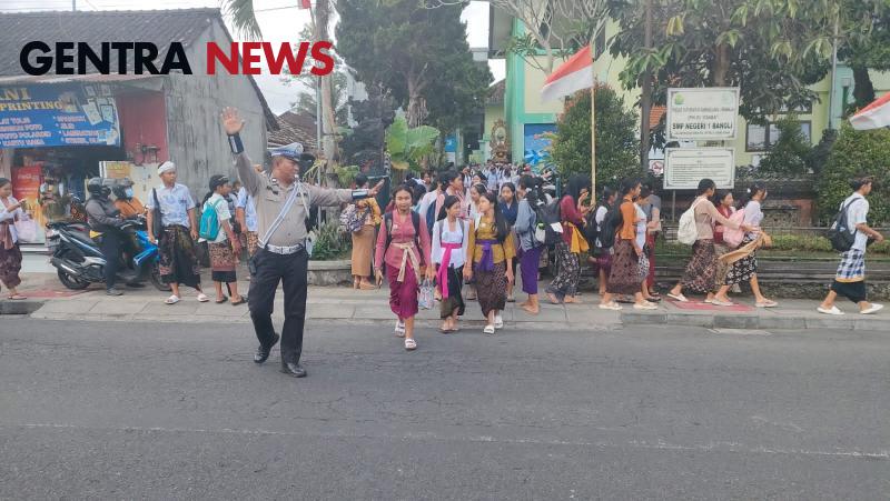 Jaga Situasi Tetao Kondusif, Unit Lantas Polsek Bangli Laksanakan Pengaturan di Depan SPMN 1 Bangli