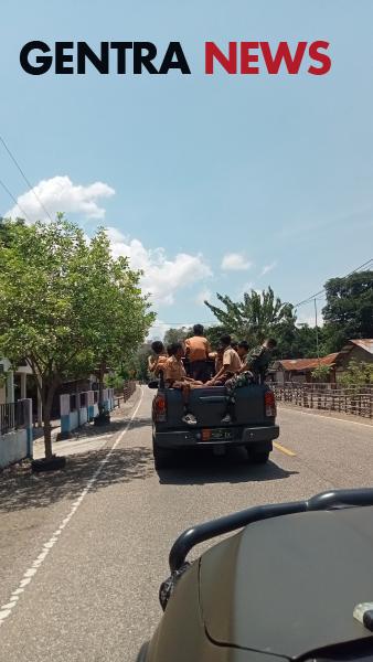 Gentra News NTT – Belu – Dansatgas Yonif 741/GN berikan tumpangan kepada anak sekolahan di perbatasan saat pulang sekolah di kota Atambua, Kabupaten Belu.