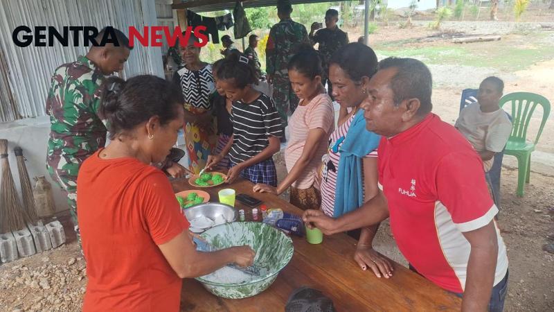 Gentra News Bali – Belu – Satgas Yonif 741/GN Pos Nunura sosialisasikan produk unggulan cemilan (manisan) dari kelapa di Desa Tohe, Kecamatan Raihat, Kabupaten