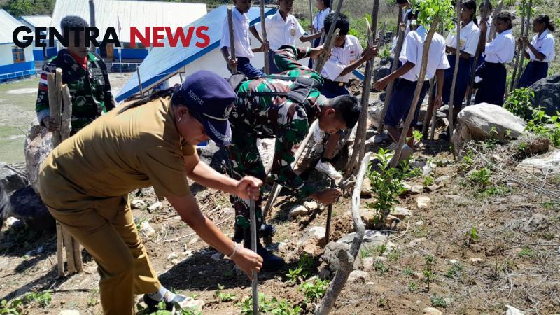 Gentra News NTT – Belu – Satgas Yonif 741/GN Pos Kewar bersama Guru pembimbing dan siswa-siswi melaksanakan kegiatan penanaman pohon di lingkungan sekolah SMPN