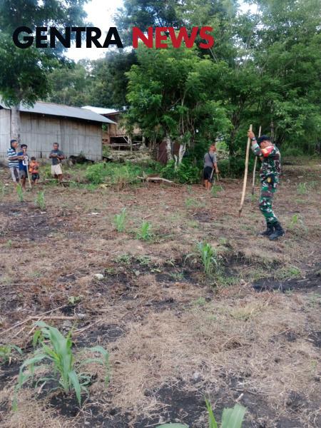 Gentra News NTT – Babinsa Koramil 04/Tabundung,Kodim 1601/Sumba Timur Pratu Denis membantu Petani saat melakukan penanaman jagung di Desa Billa,Kecamatan Tabundung,Kabupaten Sumba Timur, Selasa