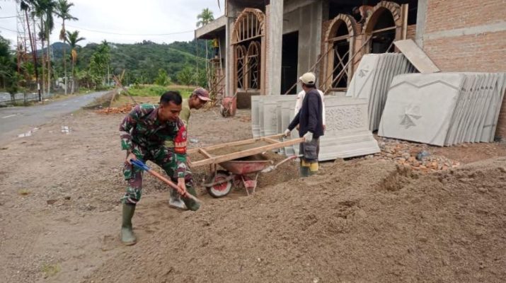 Jalin Kebersamaan Babinsa Gotong Royong Bangun Masjid