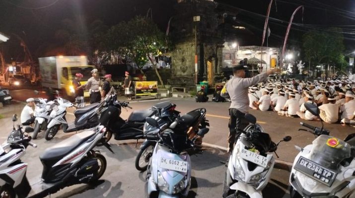 Kanit Lantas Polsek Kawasan Pelabuhan Padangbai Bersama Anggota Bersinergi dengan Pecalang Dalam Pengamanan Persembahyangan Kajeng Kliwon di Pura Pesamuhan Padangbai