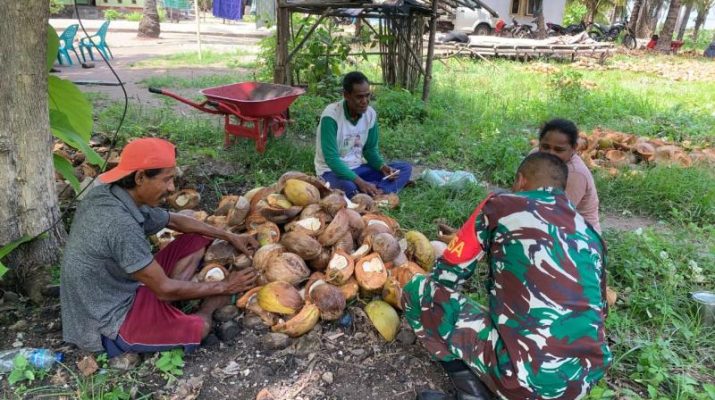 Lembata, Babinsa Koramil 1624-07/Nagawutung Kopda Syarifuddin melaksanakan komsos dengan membantu masyarakat mengupas kelapa yang rencana untuk pembuatan kopra yang berada di Desa Warawatung, Kecamatan