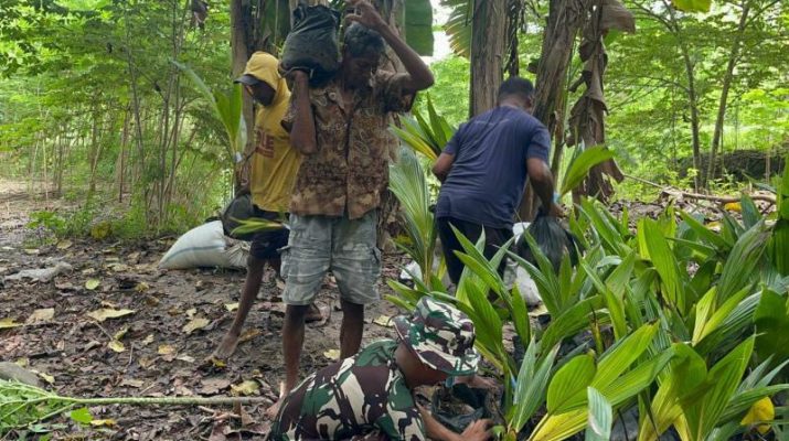 TNI Manunggal dengan Rakyat, Satgas Yonif 741/Gn Pos Maubusa Laksanakan Penanaman Bibit Pobon Kelapa