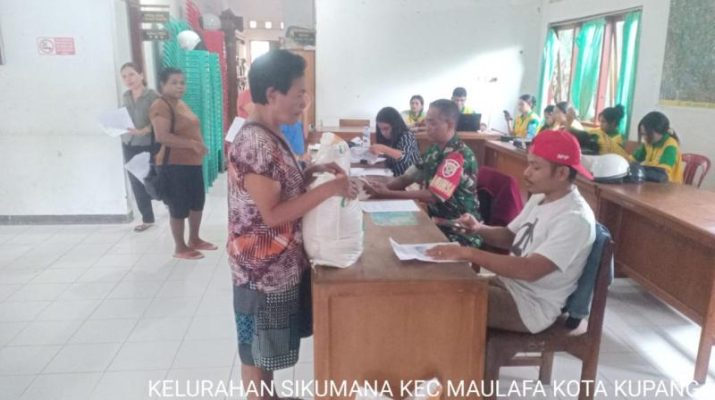 Babinsa dan Kasie Pelmas Pantau Pembagian Beras di Kelurahan Sikumana