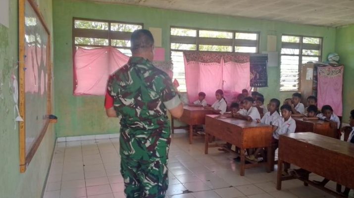 Gentra.co.id NTT – Babinsa Koramil 03/Pahunga Lodu Kodim 1601/Sumba Timur Serka Daniel Umbu Ndawa memberikan sosialisasi tentang pembelajaran MDMG (Matematika Dasar Metode Gasing) tentang