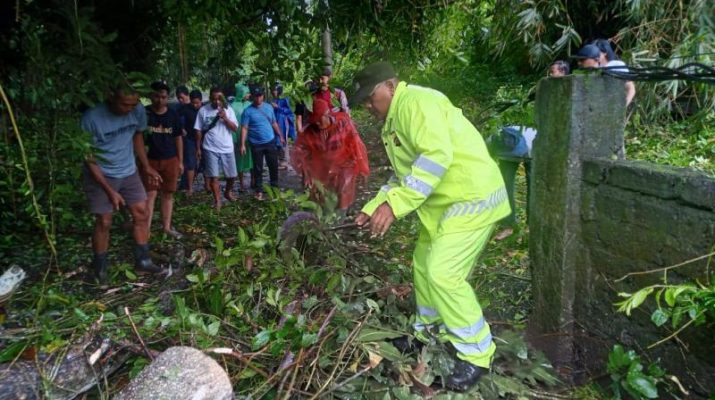 Gentra.co.id Bali – MENGWI – Personil Polsek Mengwi berbaur bersama warga melaksanakan evakuasi pohon tumbang dilingkungan Banjar Panglan Baleran, Kelurahan Kapal, Kecamatan Mengwi, Kabupaten