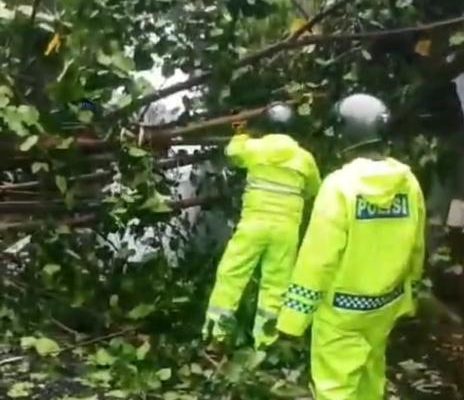 Polsek Sukawati Bersama BPBD Bersihkan Pohon Tumbang Halangi Jalan