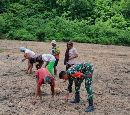 Dukung Ketahanan Pangan Babinsa Koramil 04/Tabundung Bantu Petani Tanam Padi