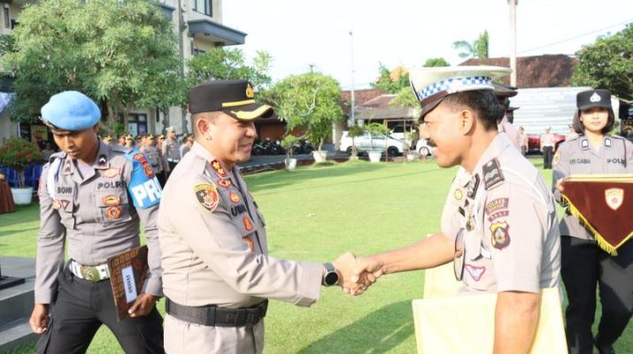 Gentra.co.id Bali – Gianyar – Kapolres Gianyar AKBP Umar, S.I.K., M. H. memimpin upacara pelepasan personel Polres Gianyar yang memasuki masa purnabakti TMT 1