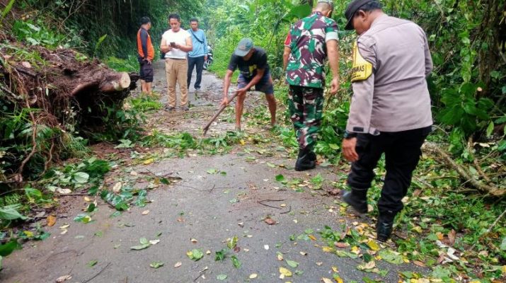 Kompak, Babinsa Tusan Bersama Bhabinkamtibmas Dan BPBD Serta Warga Evakuasi Tumbangnya Pohon Bayur