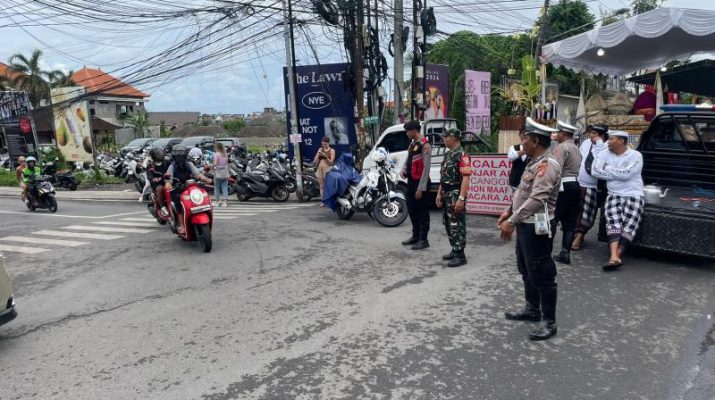 Gentra.co.id Bali – Kuta Utara – Personel Polsek Kuta Utara bersinergi dengan TNI dan Pecalang melaksanakan pengamanan sekaligus pengaturan arus lalin sehubungan adanya upacara