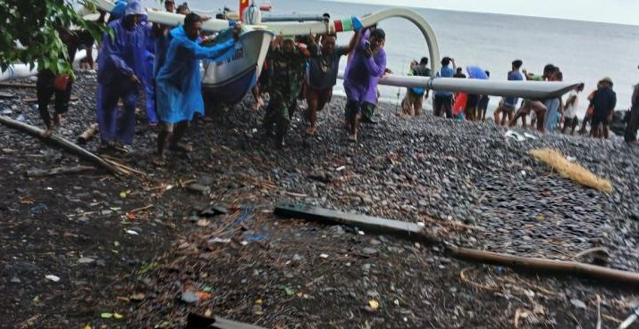 Gentra.co.id Bali – Babinsa Koramil 1623-08/Kubu Desa Tulamben Serda I Gede Sulitra bersama Warga Kelompok Nelayan bantu Evakuasi Nelayan yang mengalami keusakan mesin di