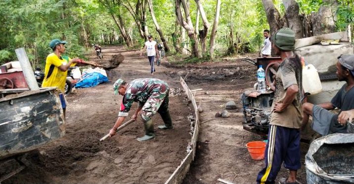 Gentra.co.id NTT – NTT – Ende/Kota Baru, Babinsa Koramil 04/Maurole, Sertu Densius Berno bersama masyarakat Desa Kota Baru, melaksanakan kegiatan karya bhakti pembuatan jalan