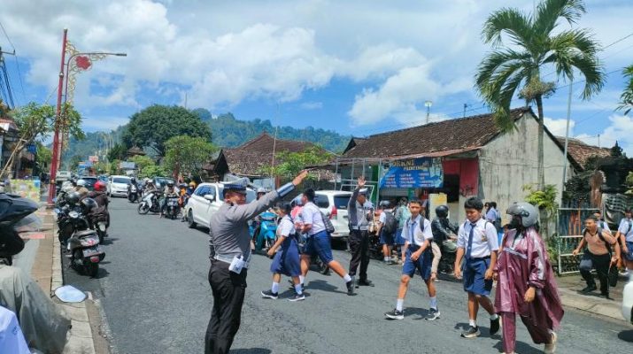 Bubaran Anak Sekolah, Unit Lantas Polsek Bangli Laksanakan Pengaturan di Depan SPMN 1 Bangli