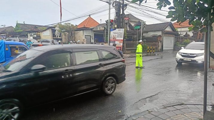 Gentra.co.id Bali – Meski diguyur hujan sejak dini hari, personil Unit Lalulintas Polsek Denpasar Timur (Dentim) tetap melaksanakan tugas pengaturan arus lalu lintas pagi
