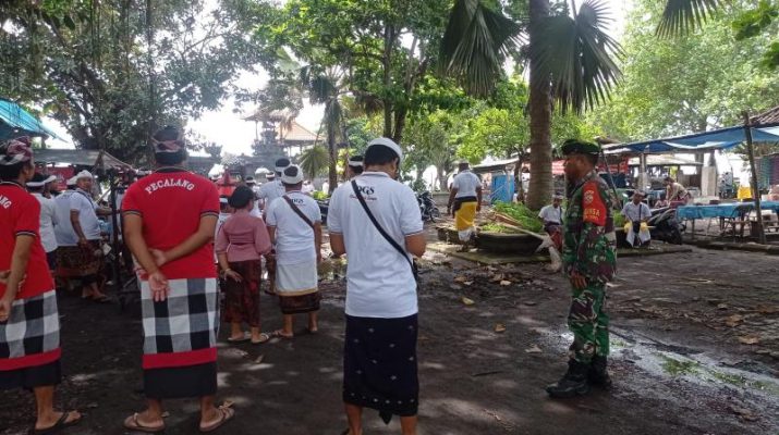 Gentra.co.id Bali – Babinsa Desa Nyuh Tebel Koramil 1623-05/Manggis Sertu I Ketut Sulastra bersinergi dengan Pecalang Desa Adat Nyuhtebel melaksanakan pengamanan upacara Melasti, di