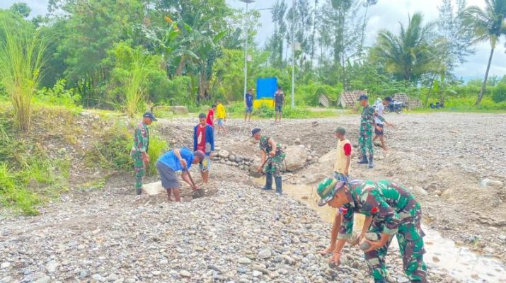 Gentra.co.id NTT – Belu – Prajurit Satgas Pos Nunura melaksanakan karya bakti gotong royong perbaikan jalan bersama masyarakat di wilayah Desa Tohe, Kecamatan Raihat