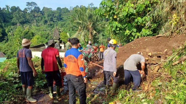 Gentra.co.id Bali – Babinsa Desa Tangkup Koramil 1623-04/Sidemen Sertu I Ketut Suartana bersama BPBD Kab. Karangasem melaksanakan gotong royong pembersihan material longsor, di jalan