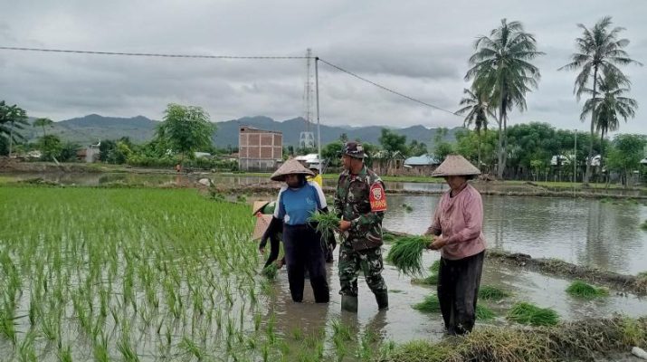 Gentra.co.id NTB – Sertu Mastudinur Babinsa Desa Malaju Koramil 04/Kilo turun ke sawah membantu penanaman padi poktan So Ala Dusun Paropa Timur Desa Malaju