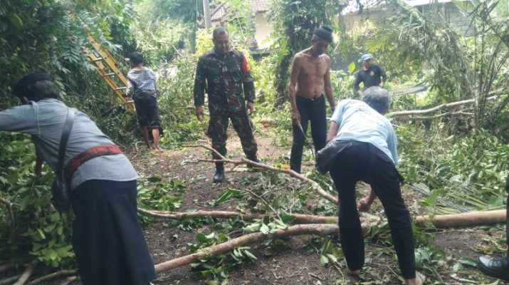 Gentra.co.id Bali – Babinsa Desa Duda Koramil 1623-06/Selat Sertu I Made Sumardika bersama warga melaksanakan gotong royong memangkas pohon yang menghalangi jalan ataupun pohon