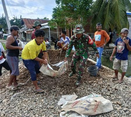 Babinsa Jala bersama Pemdes dan Warga Gotong Royong Perbaiki Akses Jalan Nelayan