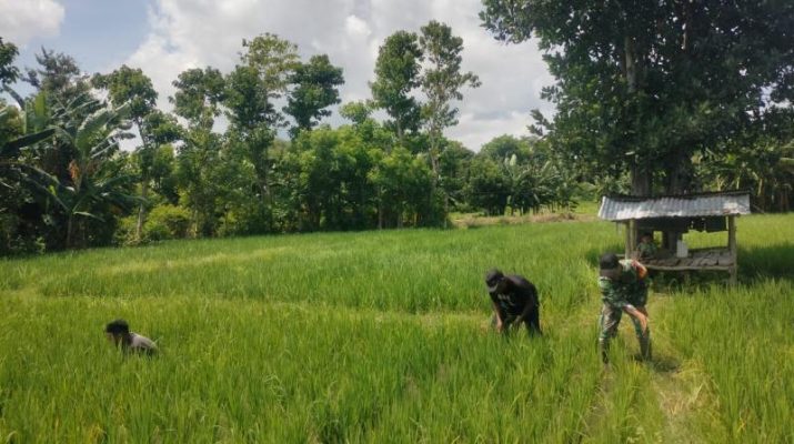 Gentra.co.id NTT – Babinsa Koramil 05/ Waingapu Kodim 1601/Sumba Timur Sertu Darusman membantu petani menyiangi rumput tanaman padi di sawah bertempat diKelurahan Lambanapu,Kecamatan Kambera,Kabupaten