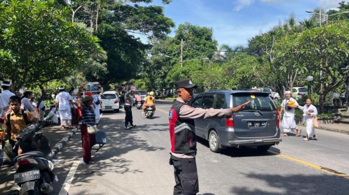 Gentra.co.id Bali – Personel Polsek Dawan melaksanakan pengamanan dan membantu menyebrangkan masyarakat yang akan melaksanakan persembahyangan di Pura Goa Lawah, Desa Pesinggahan, Sabtu, 25 Januari