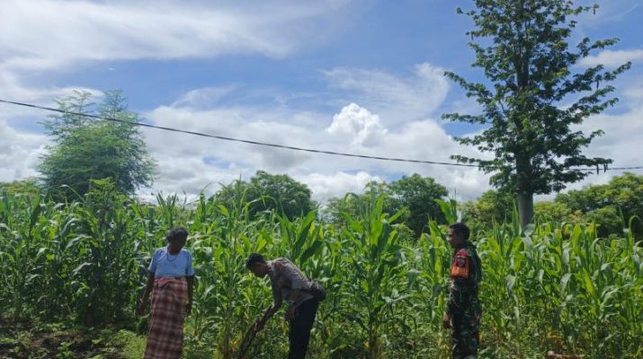 Gentra.co.id NTT – Babinsa Koramil 05/Waingapu jajaran Kodim 1601/Sumba Timur Serda Armando Ndahawali mendampingi Bapak Babu Henjang salah satu petani di wilayah binaan, meninjau
