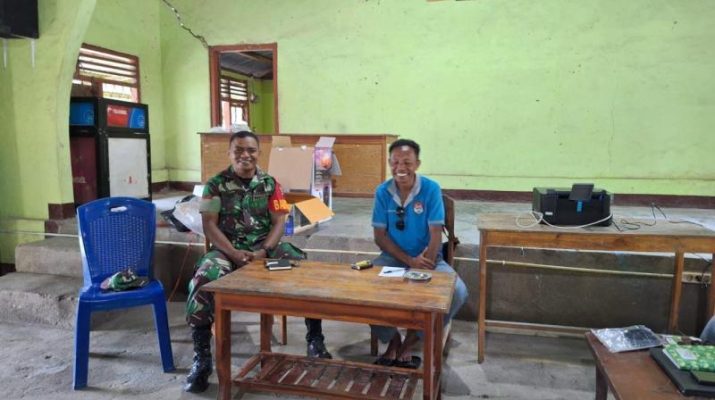 Gentra.co.id NTT – Lembata – Babinsa Koramil 1624-03/Lewoleba Kopda Edmon Florentinus Effendi Simenes melaksanakan komunikasi Sosial (Komsos), bersama Kepala Desa Lewoeleng (Sdr. Markus Corsini Raring)