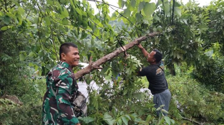 Gentra.co.id Bali – Babinsa 1623-02/Abang Desa Bunutan Serda I Wayan Sudiana bersama Warga Melaksanakan Penanganan (evakuasi) pohon tumbang yang menutupi Badan Jalan di Dusun