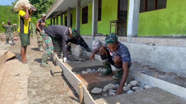 Kebersamaan Satgas TMMD Ke-123 dan Warga, Kebut Perapian Halaman SDN Lanaus.