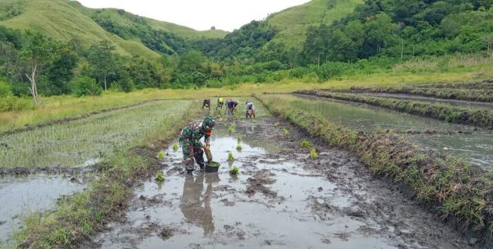 Gentra.co.id -NTT Dalam upaya meningkatkan ketahanan pangan dan mendukung kesejahteraan petani, Babinsa Koramil 04/Tabundung, Kodim 1601/Sumba Timur Sertu Ejiman turun langsung ke sawah membantu